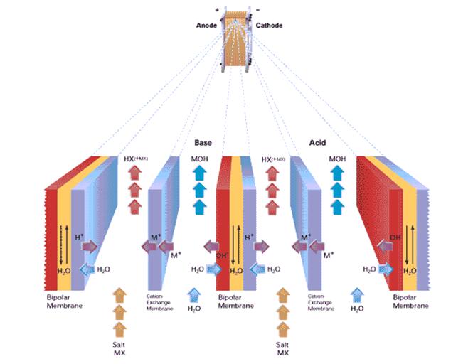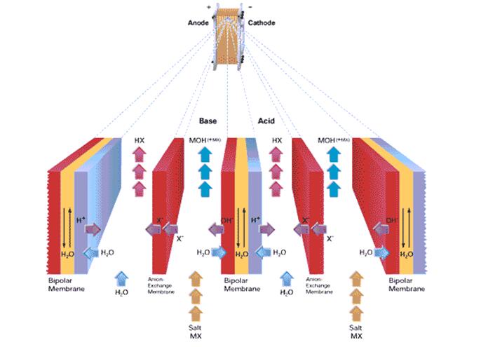 双极膜是由一个阳离子交换膜层和一个阴离子交换膜层合并而成的。双极膜电渗析是一种应用双极膜将水解离成H+和OH-,并产生酸和碱溶液的离子交换膜工艺。它也是一种电渗析工艺,因为其应用了离子交换膜在电场的驱动力下对溶液中的离子种类进行分离;但由于双极膜所特有的“水解离”能力而又与传统的电渗析不同。另外,该工艺提供了独一无二的无需添加酸或碱直接酸化或碱化工艺物料的机会,避免了副产品或废液及昂贵的下游纯化步骤。